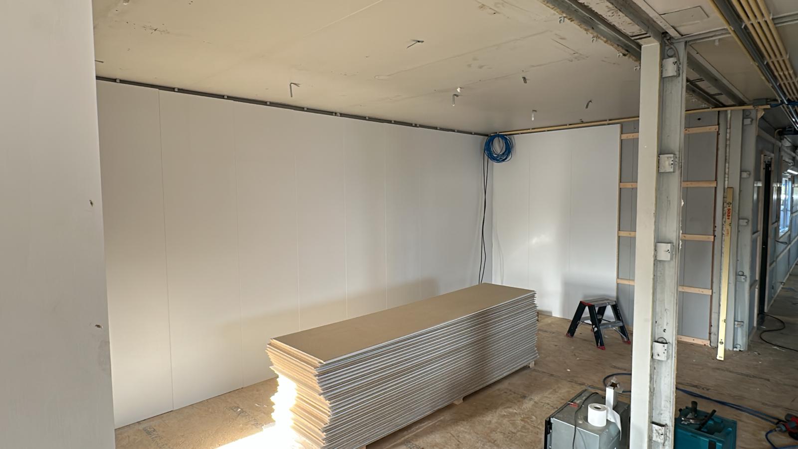 Inmiddels hebben we al mooie stappen gezet. Zo hebben we nieuwe kozijnen geplaatst en zijn de ruimtes voorzien van strakke systeemplafonds en nieuwe vloeren. De volgende fase staat inmiddels voor de deur: het aanbrengen van duurzame gevelbekleding, waarmee we het geheel niet alleen verder verfraaien, maar ook toekomstbestendig maken.